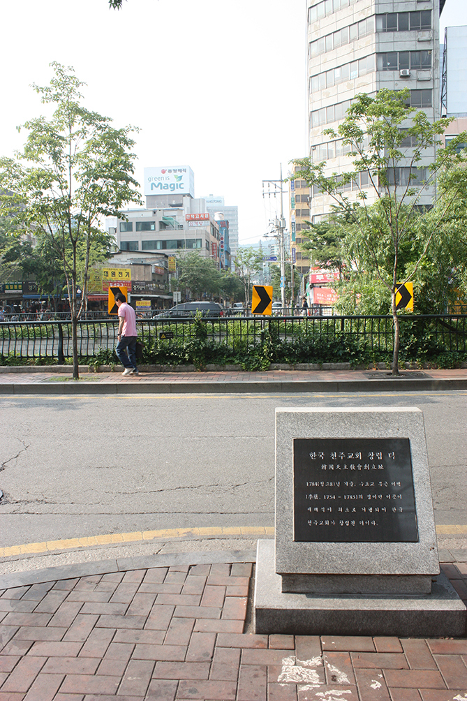 1784년 늦가을 초겨울 무렵 한양 수표교 이벽의 집에서 이승훈 베드로는 열 명 안팎의 청년에게 세례를 베풀었다. 이 세례로 설립된 신앙 공동체가 한국 가톨릭교회의 기원이 되었다. 사진은 서울 청계천변 옛 수표교 자리 인근에 설치된 한국 천주교회 창립 터 표지석. 가톨릭평화신문 DB