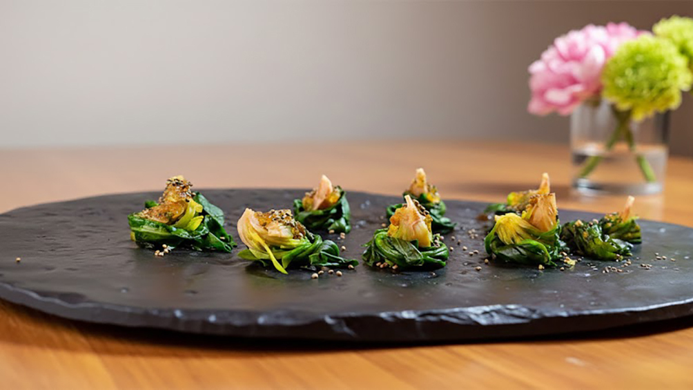 두 번째 음식은 유자소스 시금치롤이다. 살짝 데친 시금치에 새콤달콤한 유자소스를 올려 먹는다. 전채요리나 핑거푸드로 활용해도 좋은 음식이다. 시금치와 소고기로 만든 음식을 보고 소고기만 빼고 해본 음식인데 고기가 없어도 사람들이 좋아한다.