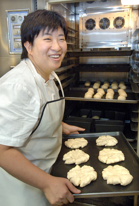 ![]() ▲ 제과제빵사 한경아씨가 반죽한 치즈빵을 성형기에 넣기에 앞서 환하게 웃고 있다.