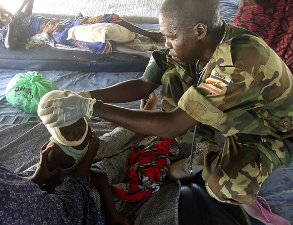 ![]() ▲ 아프리카 연합 소속 우간다 군인이 소말리아 모가디슈의 한 병원에서 정부군과 반군 교전 중에 다친 어린이를 치료하고 있다.