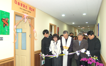 ▲ 서울 역촌동본당 `다솜 가족상담소` 개소식에서 홍성만 신부(가운데)와 김민수 신부 등 관계자들이 테이프 절단식을 갖고 있다.