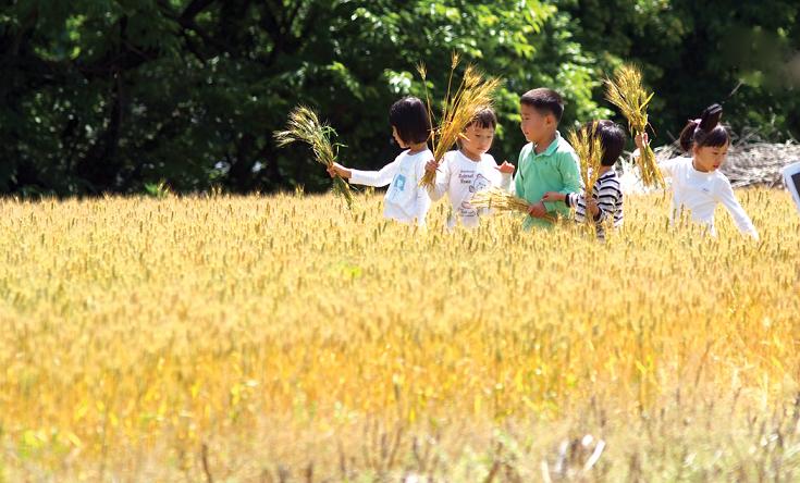 ` 행사에 참가한 어린이들이 수확한 밀을 들고 마냥 행복한 표정이다. 가톨릭농민회 안동교구연합회(회장 김병원, 담당 김시영 신부)는 연합회에서 생산한 친환경 유기농산물을 급식 등으로 공급받는 유아 교육기관과 연계해 매년 녹색체험 교실을 마련하고 있다.