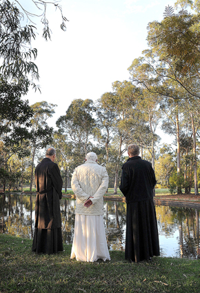 ▲ 교황 베네딕토 16세가 2008년 7월 말 호주에서 개최된 제23차 세계청년대회 중 두 사제와 함께 시드니 켄더스트 연구 센터 주변을 거닐며 호수를 바라보고 있다.