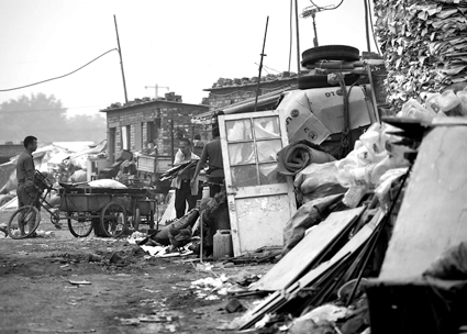 ▲ 지난해 8월 중국 베이징 교외 재활용센터에서 고물수집상에게 재활용품을 사들이고 있는 노동자들.