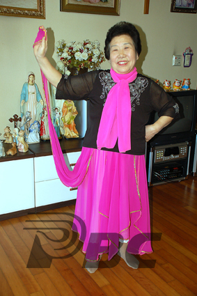▲ 이귀녀 할머니가 공연복을 입고 웰빙댄스를 선보이고 있다. [김민경 기자 sofia@pbc.co.kr]