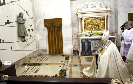 ▲ 교황 베네딕토 16세가 13일 파티마 성지에 있는 복자 히야친타와 루치아 수녀 묘지 앞에서 기도하고 있다. [파티마=CNS]