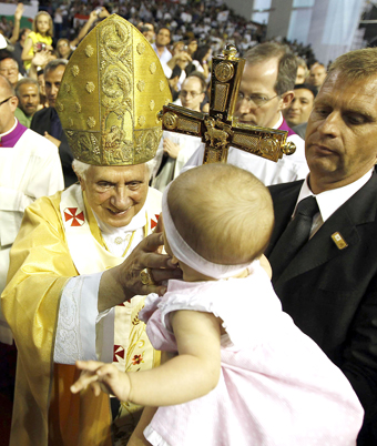 ▲ 교황 베네딕토 16세가 6일 키프로스 수도 니코시아의 엘레프테리아 스포츠센터에서 장엄미사를 마치고 퇴장하면서 한 아기를 축복하고 있다. [키프로스=CNS]