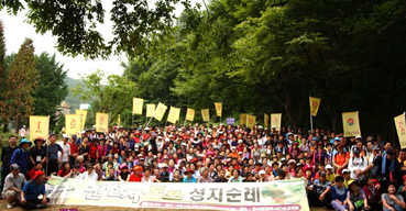 서울대교구 번동본당(주임 배갑진 신부) 신자들이 17일 도보성지순례를 마치고 황사영 묘소 앞에서 기념촬영을 하고 있다. 350여 명의 신자들은 이날 강북구 번동에서 경기도 양주시 장흥면에 있는 황사영 묘소까지 약 12㎞ 구간을 순례하며 순교자들의 순교신심을 되새겼다. 사진제공=번동본당
