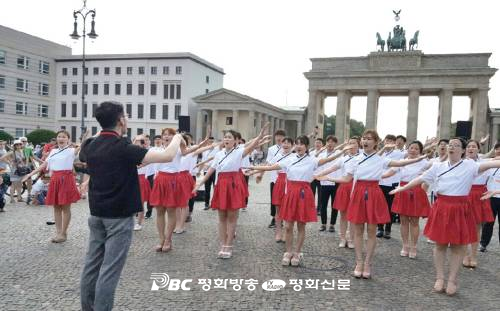 | ▲ 탈북 청년들과 남한 청년들이 독일 분단의 현장 브란덴부르크 문 앞에서 통일 기원 노래를 부르고 있다. |