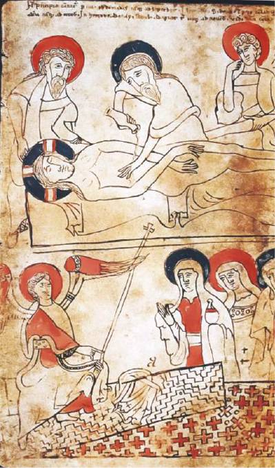 1. 1193~1195년에 그려진 프레이 사본(Prey codex)은 성 수의를 보고 그린 것이 분명하고, 따라서 성 수의는 이미 그 이전에 존재했다는 뜻이 된다. 헝가리의 부다페스트 도서관에 있는 프레이 사본 27쪽의 그림에 성 수의에 나타나고 있는 몇 가지 특성이 그대로 나타난다. 가장 뚜렷한 것은 성 수의에 나타난 인물의 팔이 엇갈려 있다는 것이고, 둘째는 엄지손가락이 손 안으로 들어가 있다는 것(손에 못을 박으면 엄지가 손안으로 들어간다), 또 천을 조각한 기하학적인 무늬가 성 수의의 무늬와 같은 헤링본 무늬라는 것이다. 또 다른 특성은 천 위에 있는 ‘L’자 모양으로 난 구멍이다. 성 수의에는 이런 모양의 구멍이 4번 있다. 이것은 이 그림을 그린 화가가 분명히 성 수의를 보고 그린 그림이라는 것이다.