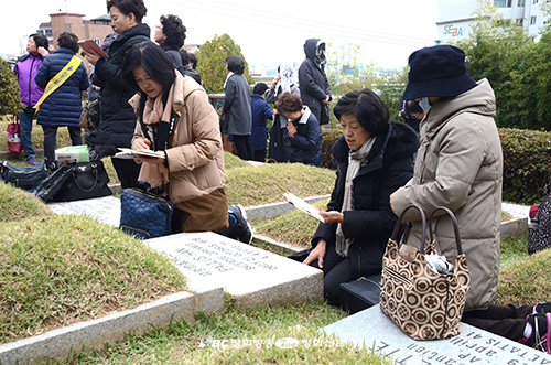 ▲ 서울대교구 위령의 날 미사에 참석한 신자들이 용산 성직자 묘역에 묻힌 선종 사제를 위해 기도하고 있다. 남정률 기자 |