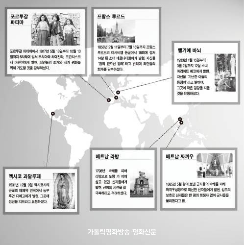 지구상에서 성모님이 발현한 곳은 파티마뿐만이 아니다. 프랑스 루르드, 멕시코 과달루페, 벨기에 바뇌 등이 있다. 전 세계적으로 성모 발현을 주장해온 곳은 400여 곳에 이르지만, 교황청이 공식 인정한 곳은 많지 않다.