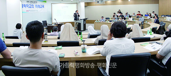 이재돈 신부는 ‘회칙 「찬미받으소서」와 가톨릭교육’을 주제로 가톨릭 학교의 생명존중·환경보전·평화·정의 교육 실천 방안과 교육자의 자세 등을 설명했다. 교육부 첨단미래학교 자문단 조기성(계성초) 교사는 태블릿 PC, 교육 애플리케이션 등을 적극적으로 도입한 계성초등학교의 스마트교실 운영 방법을 소개했다.