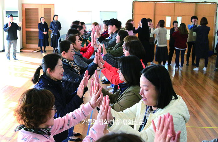 ▲ 안동교구 ‘교리 교사의 날’ 행사에 참석한 교리 교사들이 축제 한마당 시간에 레크리에이션을 하며 즐거운 시간을 보내고 있다. 안동교구 제공 |