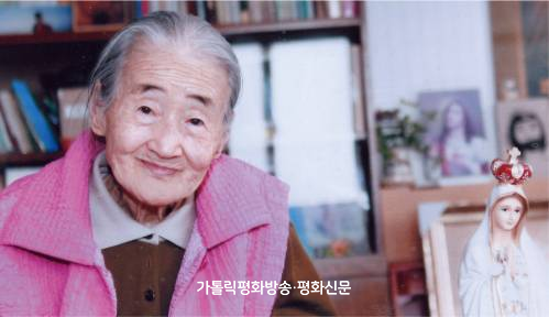 ▲ 한국 교회 최초로 아들 넷을 사제로 주님께 봉헌하고 평생 주님 안에 자녀를 위하며 살았던 이춘선 할머니가 생전 성모상 옆에서 미소 짓는 모습. |