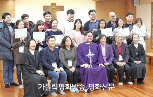 ▲ 씨튼 예비부부 주말에 참가한 젊은 부부들과 선배 부부, 사랑의 씨튼 수녀회 수녀, 예수성심전교수도회 고문찬 신부가 파견미사 후 기념촬영을 하고 있다. |