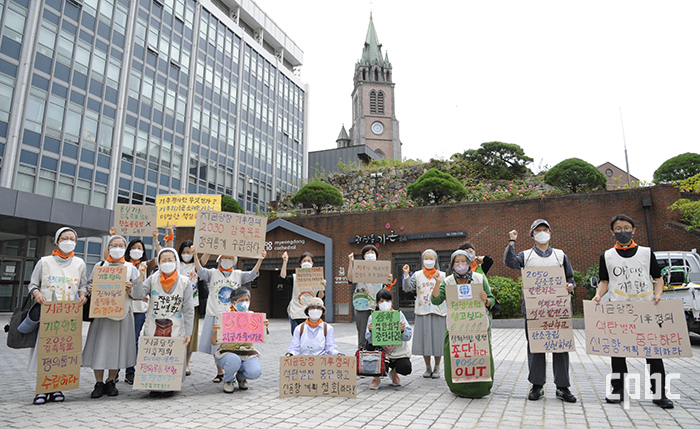 가톨릭기후행동 활동가들이 서울대교구 주교좌 명동대성당 앞 들머리에서 기후 정의를 촉구하는 구호를 외치고 있다. 가톨릭평화신문 DB