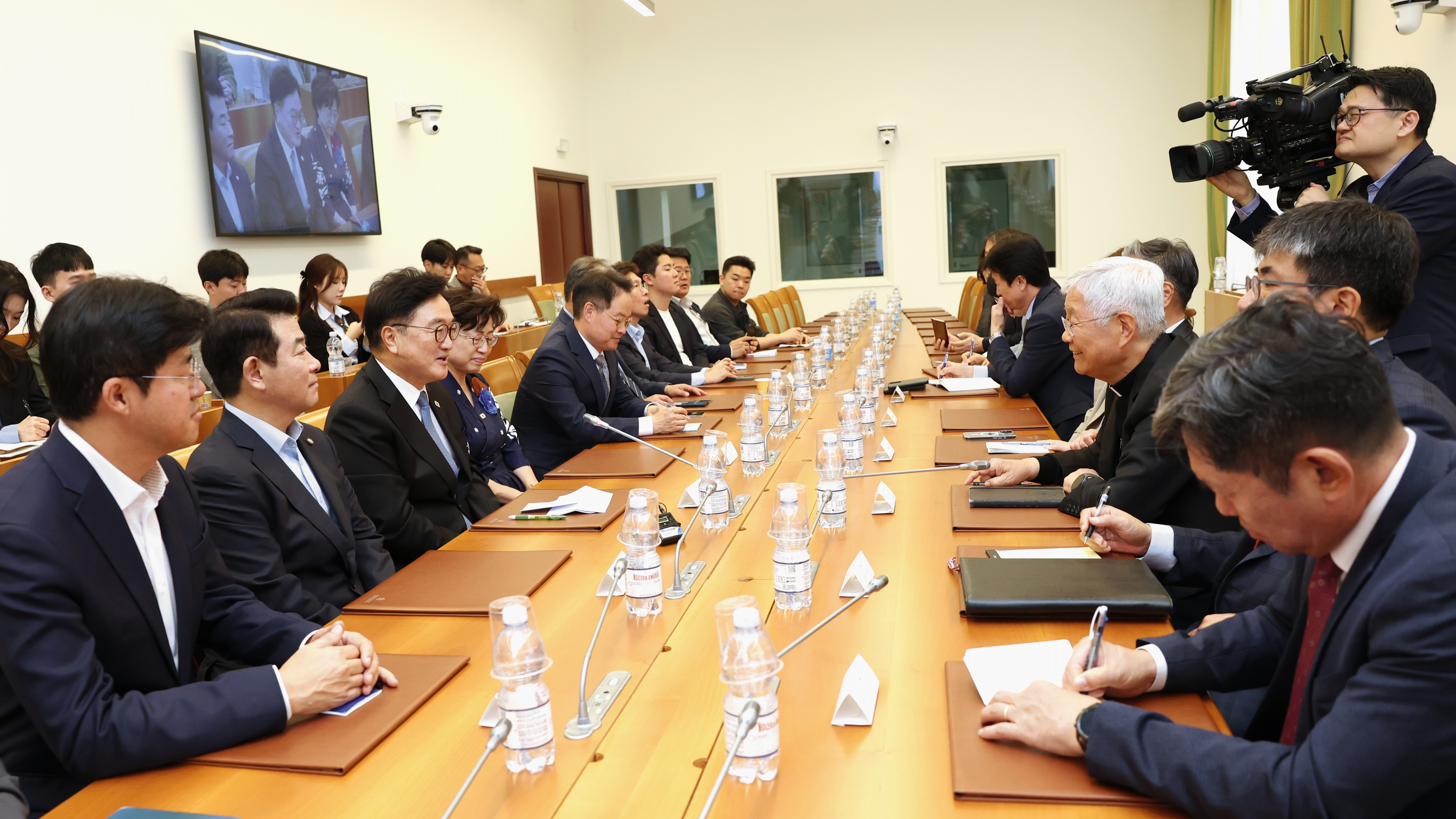 이에 유 추기경은 "의장님께서 어려운 시기에 민주주의를 지켜주신 점에 깊이 감사드린다"며 "한국 교회는 아시아 지역에서 정의와 평화를 실천하는 본보기로 평가받고 있다"고 화답했다.
