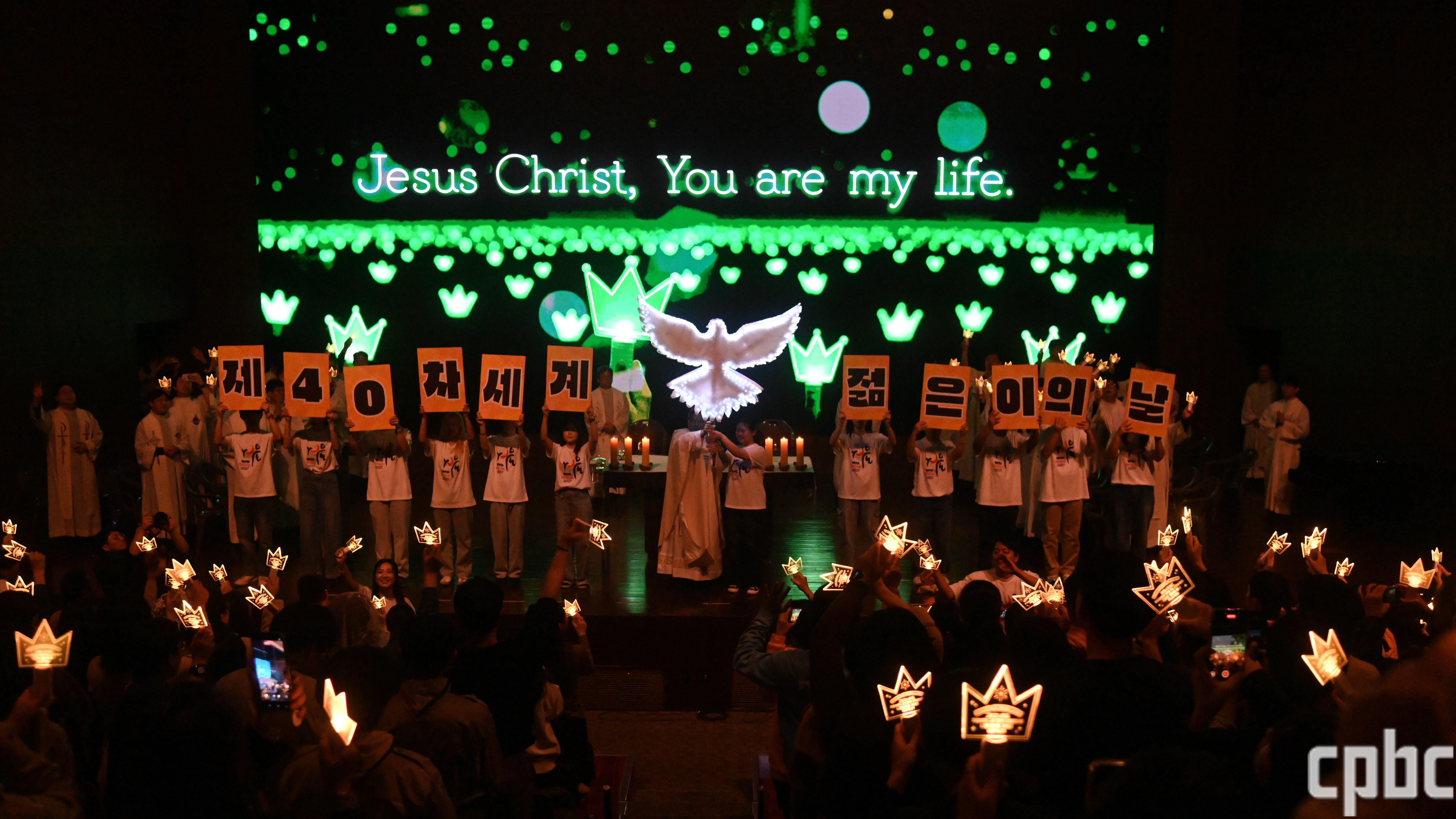 서울대교구장 정순택 대주교가 비둘기 모양 상징물을 받는 순간, 청년들이 손에 든 왕관 모양 응원봉에 빛이 들어옵니다.