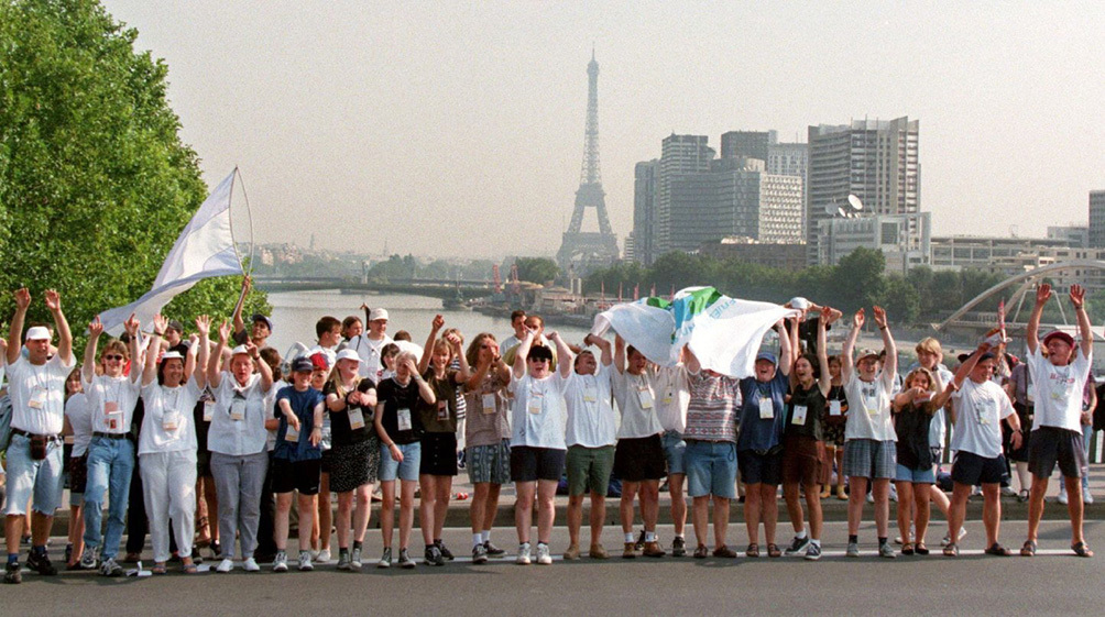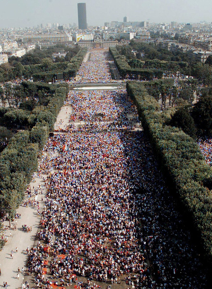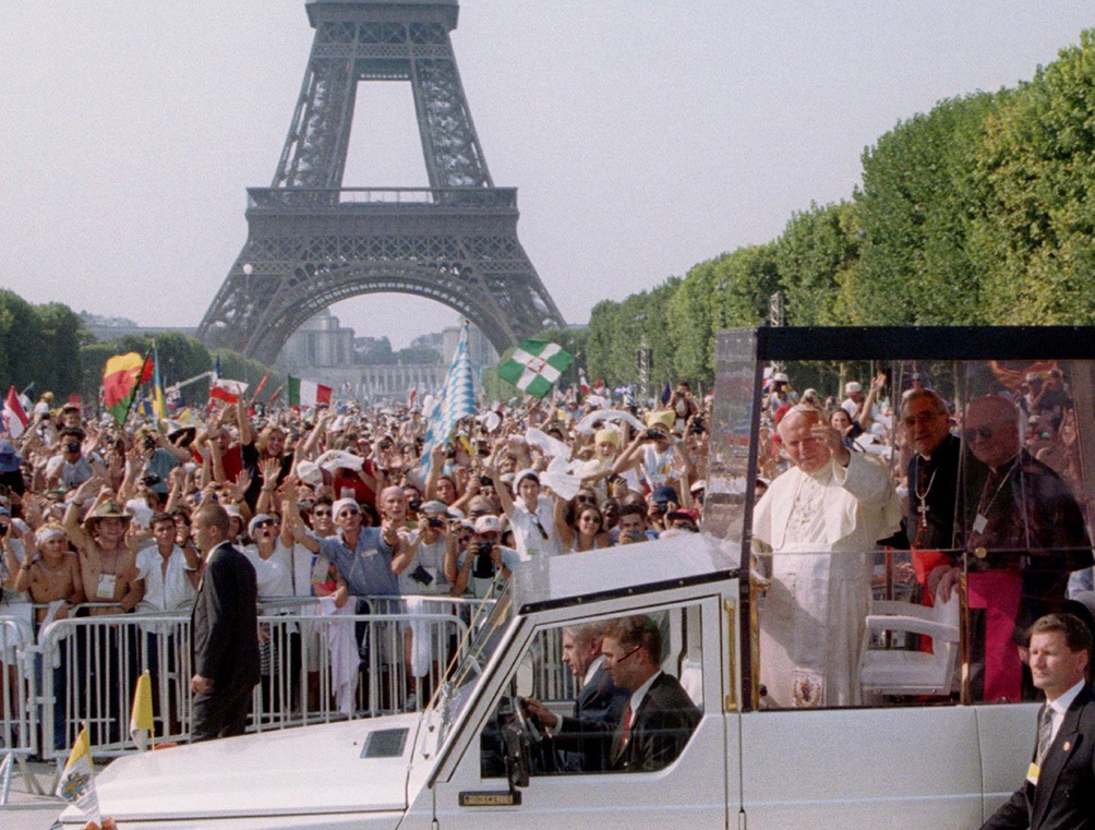 전 세계 160개국에서 온 젊은이들이 성 요한 바오로 2세 교황의 강론을 듣기 위해 1997년 8월 21일 파리 세계청년대회(WYD) 교황 환영행사가 열린 에펠탑 인근 마르스 광장을 가득 채웠다. OSV