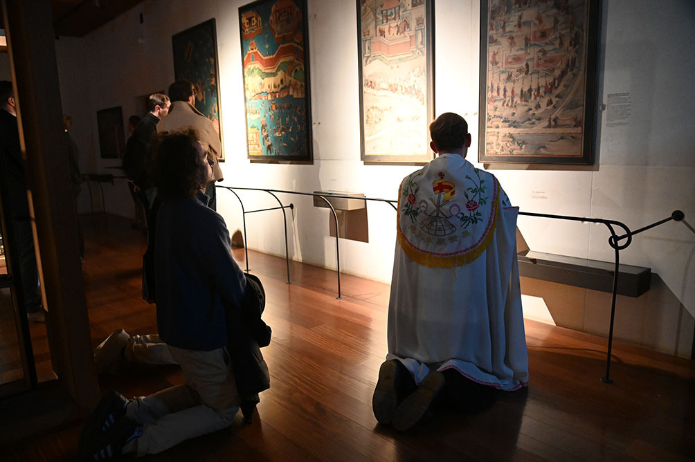 프랑스 젊은이들로 구성된 '선교를 위한 남자들'이 2025년 12월 4일 파리외방전교회의 '순교자의 방'에서 순교자들의 여정을 그린 그림 앞에서 무릎을 꿇고 예를 다하고 있다.