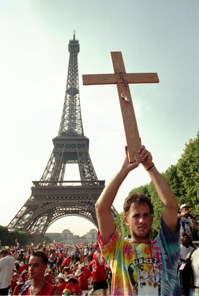 1997 파리 세계청년대회(WYD)에서 한 청년이 에펠탑 앞에서 십자가를 들고 있다. OSV