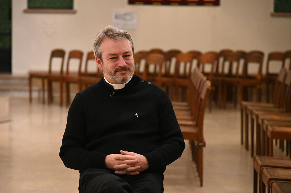 파리대교구 노트르담 도퇴유본당 주임 앙투안 드뷔엔 신부가 2025년 12월 2일 성당에서 파리 WYD에 대한 기억을 나누고 있다.