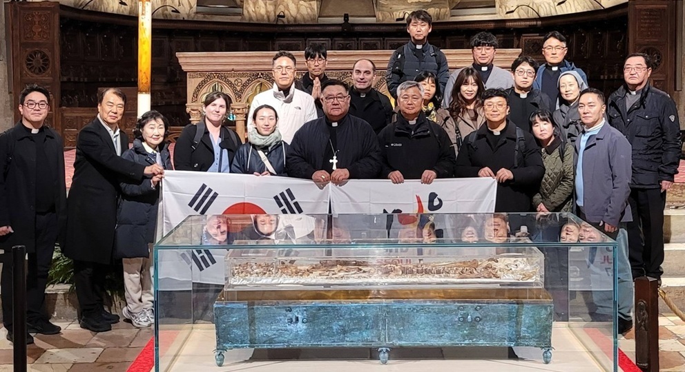 2027 서울 WYD 조직위원회 관계자들이 2일 아씨시에서 프란치스코 성인 유해에 경배하고 있다. 서울대교구 홍보위원회 제공