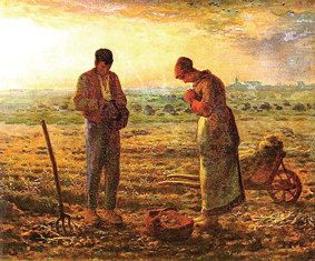 그림은 땅을 일구는 농부 부부가 감사기도를 드리는 `만종`(밀레 작, 1859년).