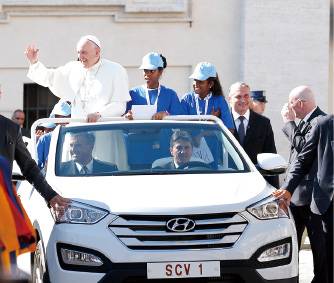 프란치스코 교황이 마더 데레사 시성식 하루 전날인 3일, 현대자동차 SUV 차량인 산타페에 올라 자비의 활동가들이 모여 있는 성 베드로 광장에 들어서고 있다. 이 흰색 차량은 2년 전 8월 한국을 방문한 교황이 성모 승천 대축일 미사를 집전하기 위해 대전 월드컵경기장에 입장할 때 탔던 것이다.