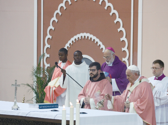 | ▲ 프란치스코 교황이 3월 31일 모로코 수도 라바트에 있는 ‘물레이 압델라 왕자 경기장’에서 미사를 집전하고 있다. 【모로코=CNS】 |