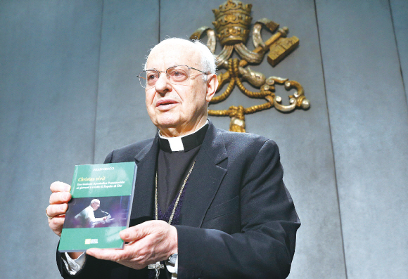 | ▲ 주교대의원회의 사무총장 로렌초 발디세리 추기경이 2일 바티칸에서 기자회견을 통해 교황 권고 「그리스도는 살아 계십니다」를 발표하고 있다. 【바티칸시티=CNS】 |