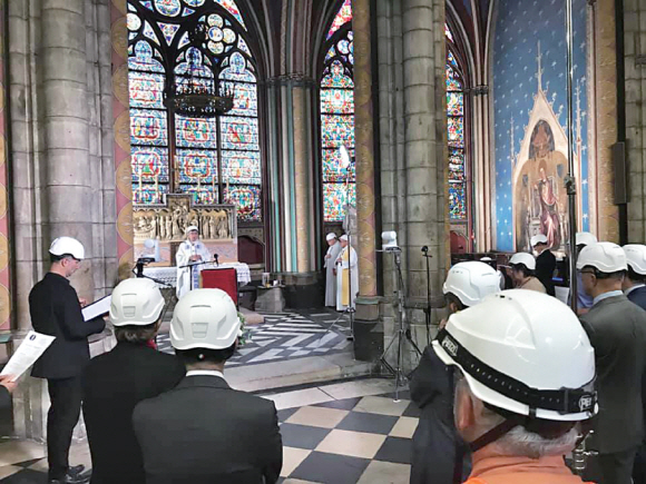 지난 4월 대형 화재가 일어났던 파리 노트르담 대성당은 화재 후 꼭 2개월 만인 15일 저녁 첫 미사를 봉헌했다. 이날 미사는 화재 피해를 보지 않은 성모 마리아 경당에서 봉헌됐다. 안전을 위해 파리대교구 측은 미사 참여자를 극히 제한했으며, 이날 미사에는 사제와 성당 직원, 복원 작업자 등 30명만 소규모로 참여했다. 곳곳이 수리 중인 데다 몇몇 지붕과 기둥이 붕괴될 위험도 있어 사제를 비롯한 미사에 참여한 모든 이가 안전모를 착용했다.
