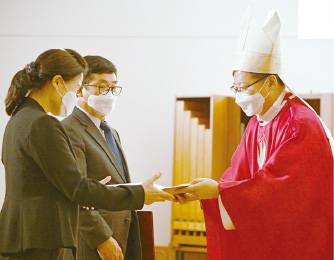 | ▲ 정순택 주교가 ‘순교자 성월을 닫는 미사’에서 서울 순례길 완주자 대표에게 축복장을 수여하고 있다. |