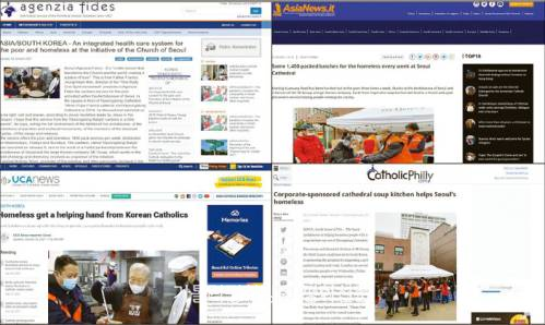 해외 가톨릭 언론사들이 서울대교구 무료급식소 ‘명동밥집’ 개소 소식을 보도했다. 교황청 인류복음화성 선교 소식지 ‘피데스(Fides)’와 교황청 외방전교회 소속 매체인 ‘아시아뉴스(AsiaNews)’, 아시아 최대 가톨릭 통신사인 ‘아시아가톨릭뉴스(UCA News)’가 명동밥집을 집중 조명했다. <사진>