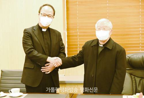 | ▲ 임명 이튿날인 3일 군종교구청을 방문한 서상범 주교 임명자가 유수일 주교와 악수로 축하 인사를 주고받으며 환하게 웃고 있다. 이정훈 기자 |