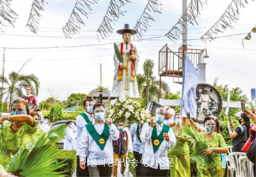 | ▲ 필리핀 말롤로스교구 신자들이 1월 30일 성 김대건 안드레아 신부상을 모시고 행렬하며 롤롬보이 ‘성 김대건 안드레아 성당’ 교구 순례지 승격 예식을 진행하고 있다. 말롤로스교구 제공 |