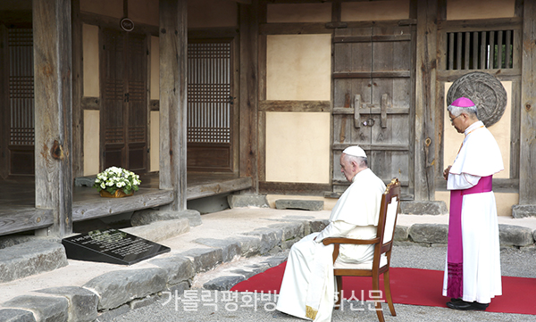 | ▲ 프란치스코 교황은 성 김대건 신부 탄생 200주년을 맞아 특별 메시지를 보냈다. 사진은 2014년 한국을 방문한 교황이 성 김대건 신부 생가를 찾아, 당시 대전교구장 유흥식 주교의 도움을 받아 헌화하고 마당에 놓인 의자에 앉아 잠시 기도하고 묵상하고 있는 모습. 가톨릭평화신문 DB |
