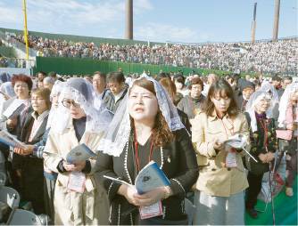 ▲ 일본 신자들이 2019년 사목방문한 프란치스코 교황 주례 미사에 참여하고 있다. 【CNS】 |