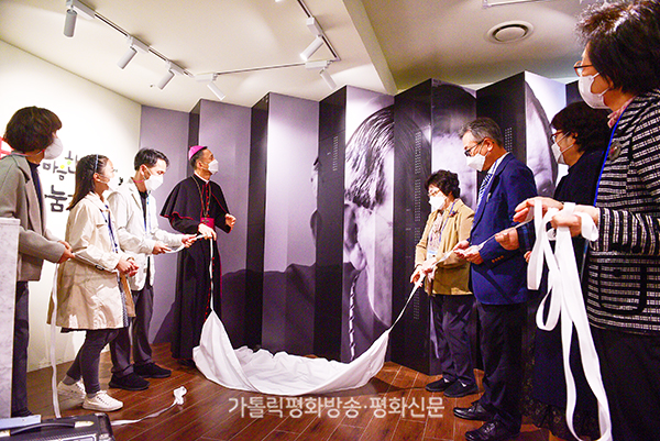 | ▲ 한마음한몸운동본부 이사장 유경촌 주교와 장기기증자 유가족들이 본부 나눔자리 장기기증자 기억공간에 달린 천을 당기고 있다. 한마음한몸운동본부 제공 |