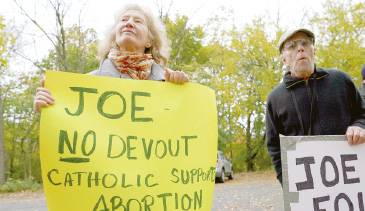 | ▲ 지난해 11월 한 여성이 조 바이든 대통령 당선인이 미사 참여 중인 워싱턴의 한 성당 앞에서 그를 비난하는 시위를 하고 있다. 【CNS】 |