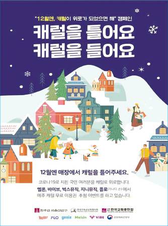 문화체육관광부는 종교계(서울대교구, 한국기독교교회협의회, 한국교회총연합), 지상파 라디오 방송사(KBS, MBC, SBS), 음악서비스 사업자(멜론, 바이브, 벅스뮤직, 지니뮤직, 플로)와 함께 12월 1~25일 캐럴 활성화 캠페인 ‘12월엔, 캐럴이 위로가 되었으면 해’를 추진한다.