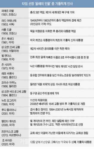 미국 예수회가 발행하는 잡지 「아메리카」에 따르면, 1927년 이래 타임의 ‘올해의 인물’에 선정된 가톨릭계 인사가 15명이나 된다. 소비에트 연방의 공산 정권 붕괴에 결정적 역할을 한 성 요한 바오로 2세 교황(1994) 같은 성직자가 있는가 하면 사회에서 독실한 가톨릭인이라고 인정받은 평신도도 있다. 전후 독일 재건에 기여한 아데나워 총리(1953)와 폴란드 자유노조운동의 기수 바웬사(1983)가 그들이다.