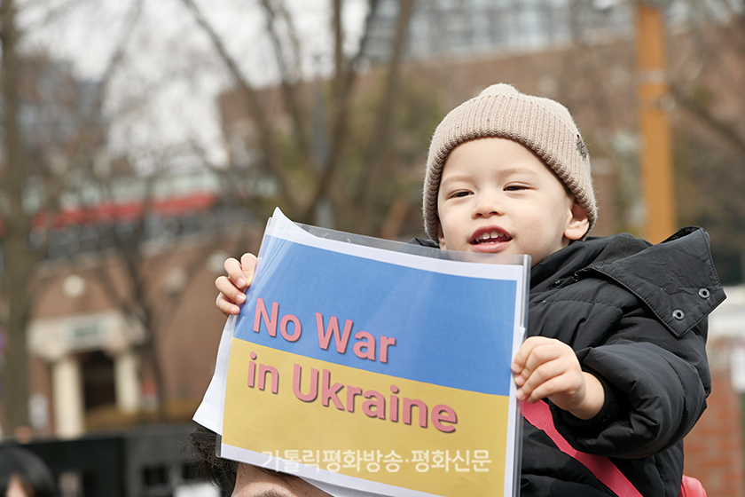 2월 28일 서울 중구 주한 러시아대사관 앞에서 열린 러시아의 우크라이나 침공 규탄 집회에 참석한 어린이가 전쟁을 반대하는 손팻말을 들고 있다. 이 어린이는 한국인 아버지와 우크라이나인 어머니 사이에서 태어났다.