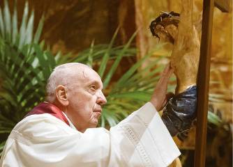 | ▲ 지난해 주님 수난 성금요일 예식에서 십자가에 못 박히신 예수 그리스도를 경배하는 프란치스코 교황. 【CNS 자료사진】 |