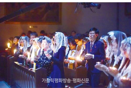 | ▲ 전국의 교구장 주교들은 주님 부활 대축일 담화를 통해 부활의 은총이 온 세상과 신자들의 가정에 함께하길 기원하며, 코로나 팬데믹으로 움츠렸던 신앙생활을 온전히 회복해 나가자고 당부했다. 2017년 4월 15일 서울대교구 주교좌 명동대성당에서 봉헌된 부활 성야 미사에 참여한 신자들이 초에 붉을 밝히고 그리스도의 빛을 이웃과 함께 나눌 것을 다짐하고 있다. 가톨릭평화신문 DB |