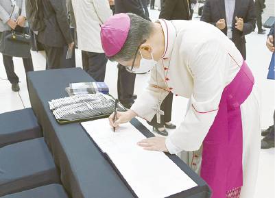 | ▲ 정순택 대주교가 옴니버스 파크 개관식 방명록에 서명하고 있다. |