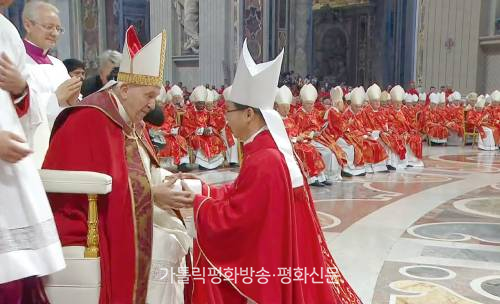 서울대교구장 정순택 대주교가 성 베드로와 성 바오로 사도 대축일인 6월 29일 바티칸 성 베드로 대성전에서 프란치스코 교황에게 팔리움을 받고 있다.