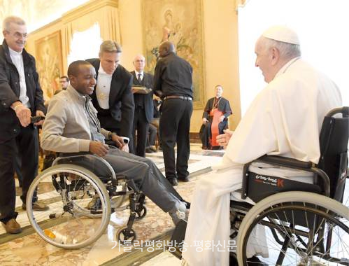 ▲ 프란치스코 교황이 6월 18일 휠체어에 앉아 자신처럼 다리가 불편한 콤보니선교사회 신부와 대화하고 있다. 【바티칸시티=CNS】 |