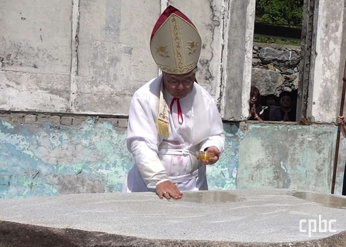 원주교구장 조규만 주교가 6일 상동공소 봉헌 미사에서 제대에 도유하고 있다.
